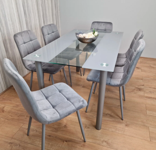 Transform your dining space with this sophisticated dining set, featuring a sleek grey and clear tempered glass dining table paired with six plush grey velvet chairs.
